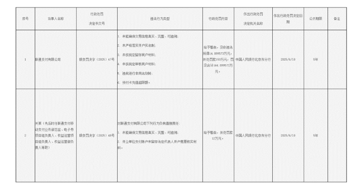 联通支付有限公司因多项违法违规行为受到处罚。具体违法违规行为包括:未能确保交易信息真实、完整、可追溯;未严格落实开户实名制;未按规定留存商户材料;未按规定审核商户材料;违规进行非同名划转;预付卡充值超限额。中国人民银行北京市分行对其给予警告,没收违法所得14.899573万元,并处罚款150万元,罚没合计164.899573万元。同时,先后时任联通支付移动支付业务部总监、电子券项目组负责人、权益运营项目组负责人、权益运营部负责人等职的关某,因对联通支付有限公司“未能确保交易信息真实、完整、可追溯;开立单位支付账户未留存法定代表人开户意愿核实材料”的违法行为负有责任,被警告,并处罚款12万元。